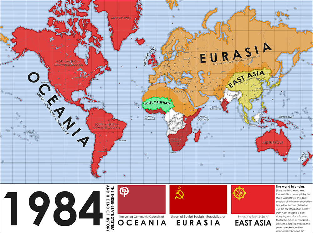 In Orwells wereld is de aarde verdeeld in drie vrijwel stabiele machtsblokken die voortdurend in wisselende oorlog zijn. Die oorlog is niet bedoeld om te winnen, maar om interne controle te legitimeren. De vijand is noodzakelijk; hij rechtvaardigt surveillance, repressie en het opofferen van individuele vrijheid. De bevolking hoeft niet te begrijpen waarom men vecht — alleen dát men vecht.